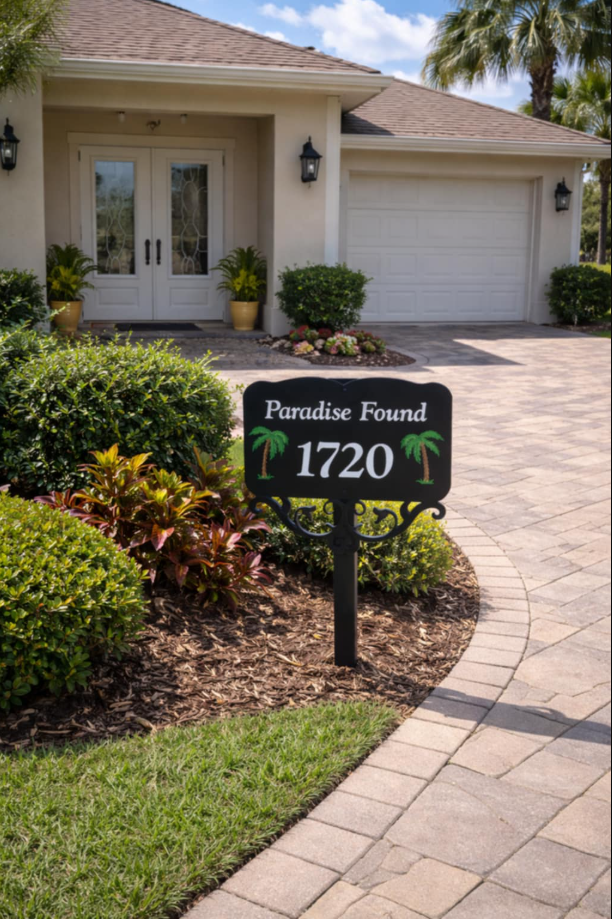 Our custom metal lamp post signs are precision CNC plasma cut from durable .09 aluminum and finished with a high-quality powder coat for long-lasting beauty and weather resistance. Designed specifically for retirement communities, these signs provide a clean, elegant way to display home names, addresses, or personal designs while enhancing the overall look of your home. With multiple styles, colors, and graphic options available, each sign can be personalized to reflect your character and individuality.